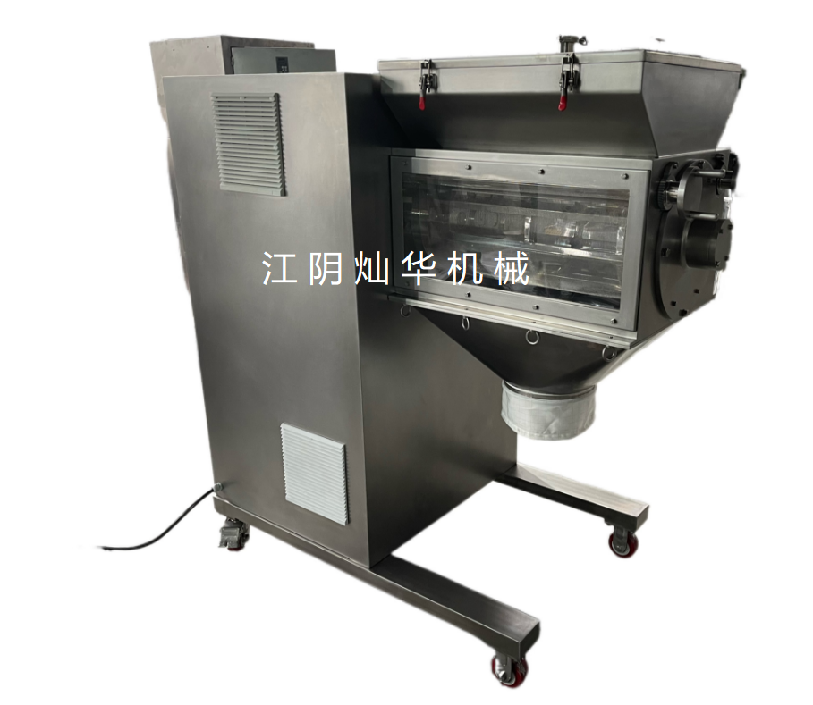 制粒过程:在粉碎干料时,凝结成块状的物料在由五角滚刀制成的滚筒中进行冲撞粉碎,并强迫干料通过筛网。滚筒上的刮刀的挤压和剪切作用下,湿物料挤过筛网变成颗粒,落于接受盘中。