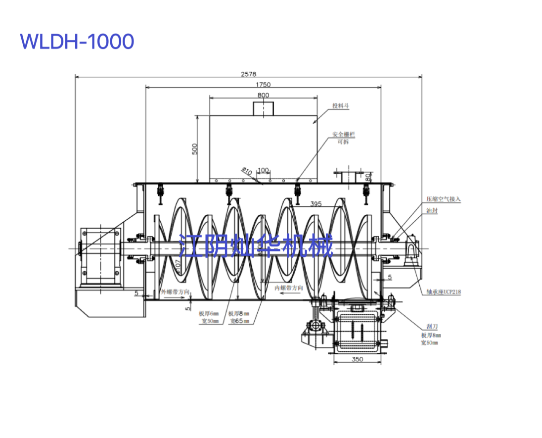 设备结构:螺条式混合机主要由驱动机构、“U”型筒体、螺条搅拌机构、机盖、支架及出料机构等部分组成。其中,“U”型筒体和螺条搅拌机构是关键部分,它们共同作用,使得物料能够在筒体内进行充分的混合。
